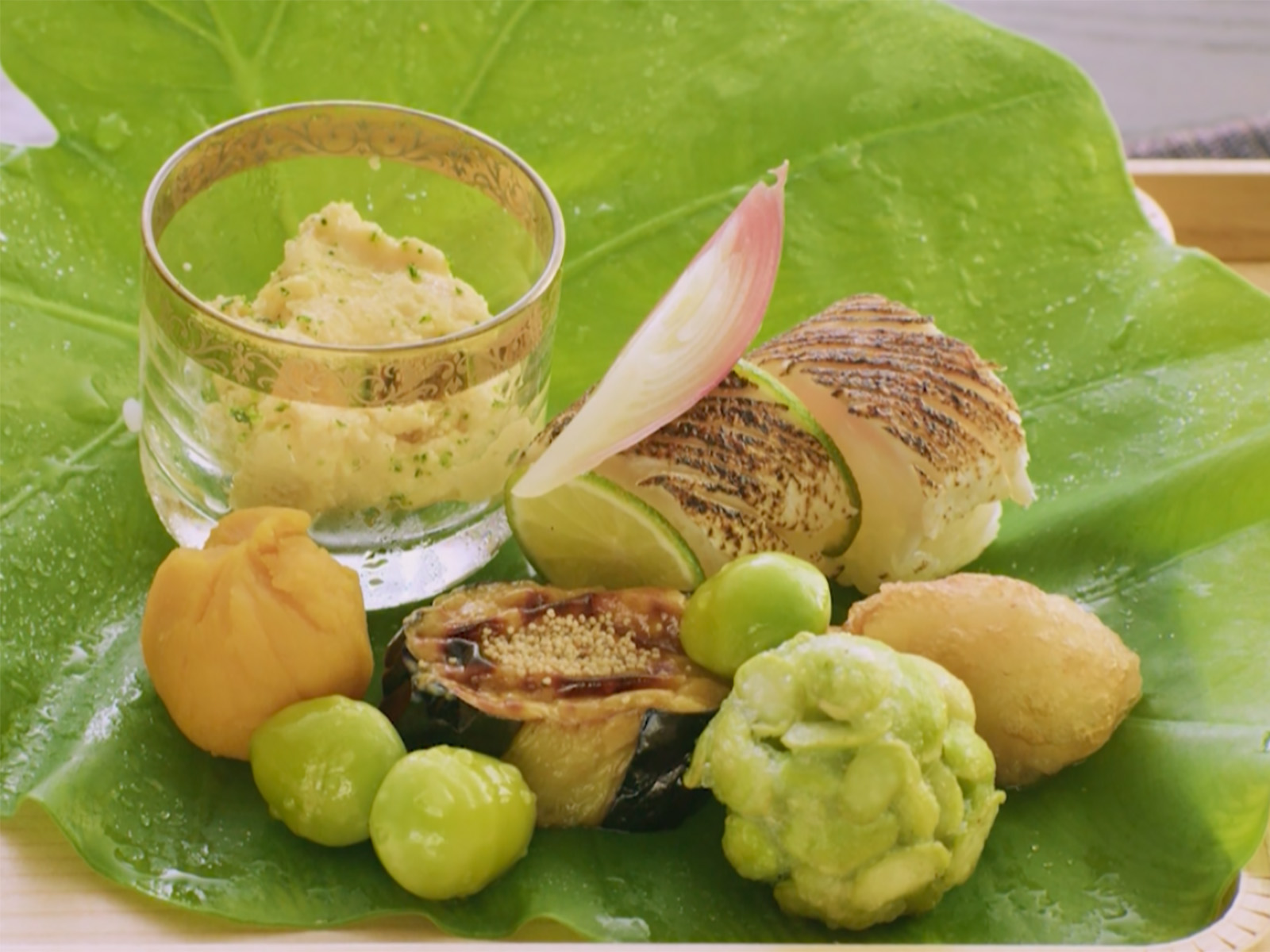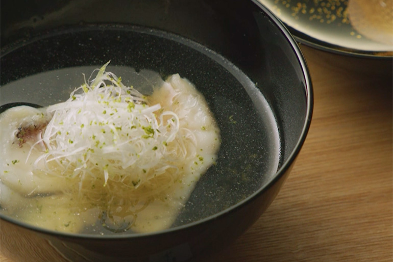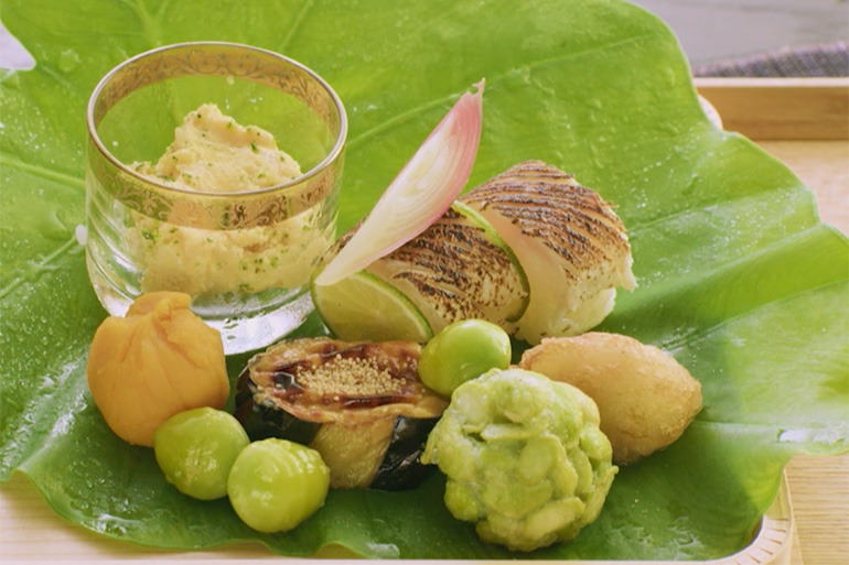 「やっぱりだしが一番。まだ暑いですから、あえてアマダイのだしは入れずにすっきりとすまし汁で」と仕立てた椀(わん)物には、青ユズを散らします。ふわりとかぶせた芋の葉を開くこと、椀のフタを開けて香り立つユズがまだ青いこと。そうしたこまやかな気遣いが、料理を通して季節のあいさつを交わすような交流を生みます。