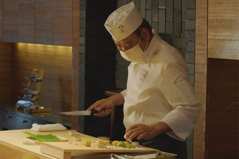 カウンターの向こうに広がる苔(こけ)むす庭園と、洋画家・中川一政がしたためた「無碍山房」の書をはじめ店内を彩る調度品は、まるで茶会で亭主が客人をもてなすかのよう。その季節、その場所、その瞬間でしか味わえない一期一会の喜びを、料理人は心を尽くしてもてなす。京都の食文化を成熟させてきたのは、豊かな水の恵みに加え、創意工夫を凝らしてきた人々のおもてなしの心です。