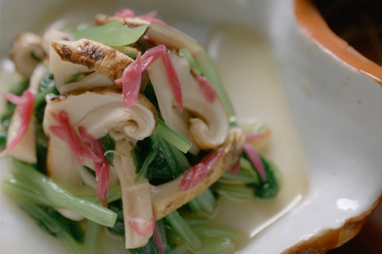 マツタケ、ギンナン、キクの花……。季節の色と香りをちりばめた「瓢亭(ひょうてい)」の料理も、刹那の食の美そのもの。450年の歴史の中で培われた「瓢亭たまご」や「明石鯛(たい)のお造り」といった定番料理がある一方で、その季節にしか味わえない旬の食材を用意することは、客人への最上級のもてなしです。食べてしまえば、膳の上の季節の景色は一瞬で消えてしまう。その儚く美しいひと時のために、料理人は心を尽くすのです。