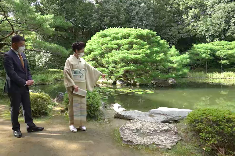 庭園を案内するのは、作庭の名門「御庭植治」の次期12代目・小川勝章さん。「平安神宮 神苑」を手がけた7代目・小川治兵衛の子孫にあたります。