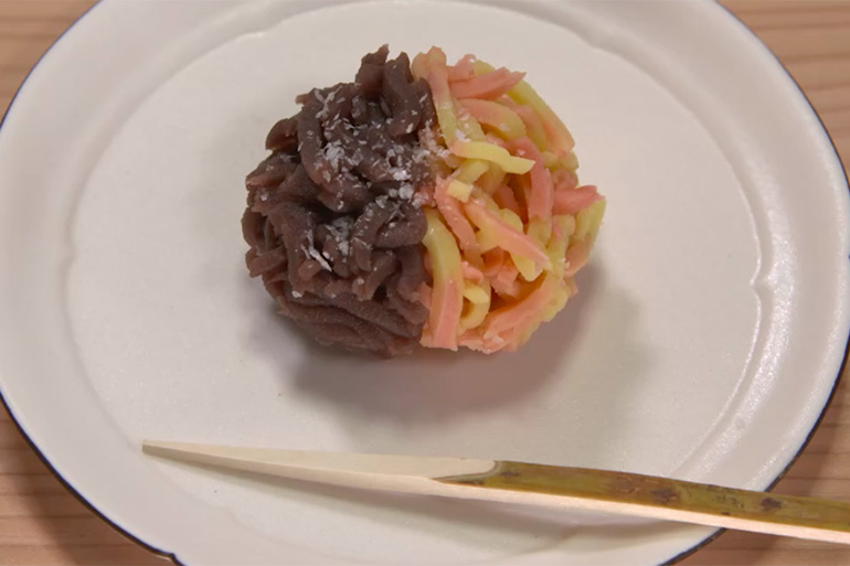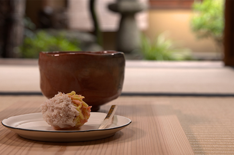 地元の常連客や茶人からもひいきにされる、1882(明治15)年に創業した「塩芳軒(しおよしけん)」の上生菓子。京菓子の基本である「きんとん」は、ほとんど同じ形ながら、色とニュアンスの微妙な変化で季節を表現します。左右できんとんの表情が異なるこちらの生菓子、銘は「雲錦(うんきん)」。黄と橙(だいだい)で表現された右半分は錦のもみじを、糸のように細い淡いピンク色のきんとんで表現された左半分は、なんと桜を意味しているといいます。