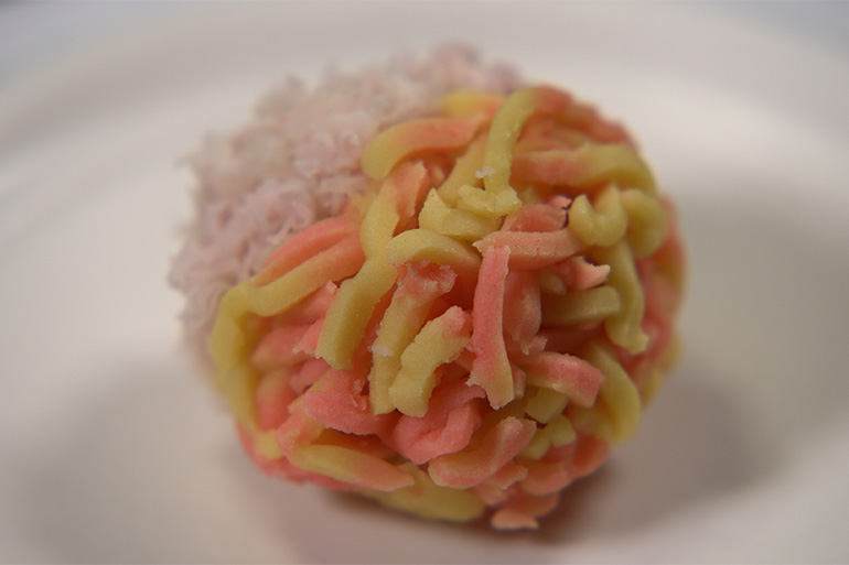 地元の常連客や茶人からもひいきにされる、1882(明治15)年に創業した「塩芳軒(しおよしけん)」の上生菓子。京菓子の基本である「きんとん」は、ほとんど同じ形ながら、色とニュアンスの微妙な変化で季節を表現します。左右できんとんの表情が異なるこちらの生菓子、銘は「雲錦(うんきん)」。黄と橙(だいだい)で表現された右半分は錦のもみじを、糸のように細い淡いピンク色のきんとんで表現された左半分は、なんと桜を意味しているといいます。