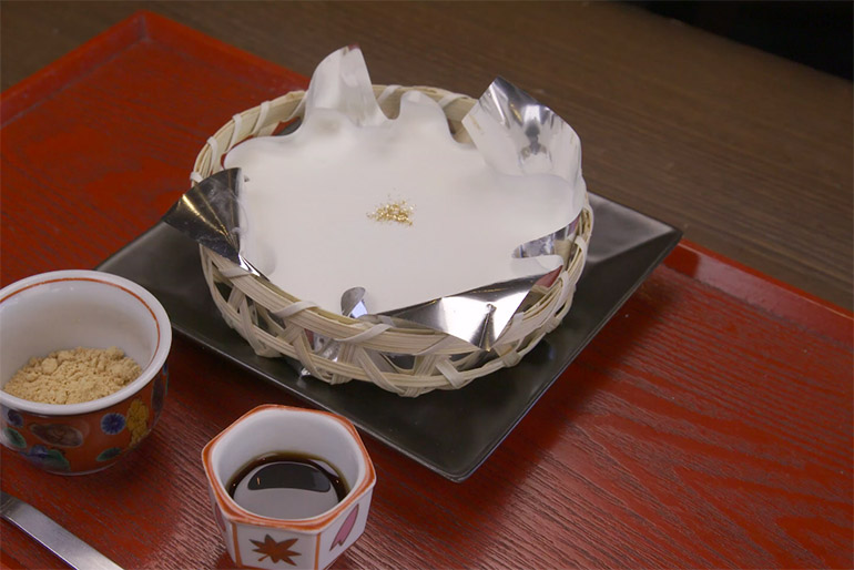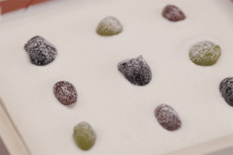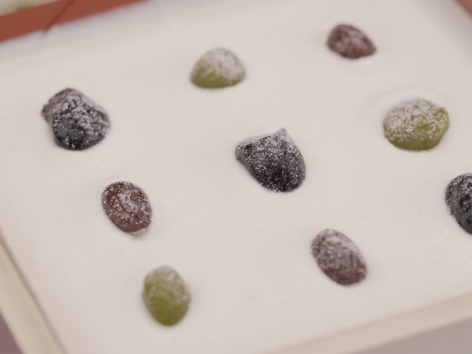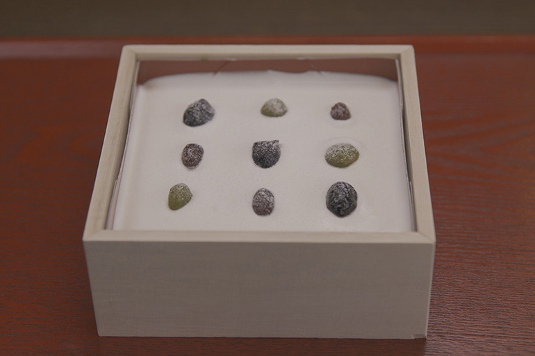 折り箱の中に広がる一面の白い庭に、ぽつぽつと並ぶ黒豆、小豆、うぐいす豆。うっすらと雪化粧をしたように見えるのは、仕上げに振りかけられた粉砂糖です。こちらの「絹ごし緑茶てぃらみす」は、左京区の名刹(めいさつ)・詩仙堂丈山寺や圓光寺(えんこうじ)に向かう路地に店を構える「一乗寺中谷」のスペシャリテ。オンラインショップでの予約販売は9カ月待ちという、大人気スイーツです。