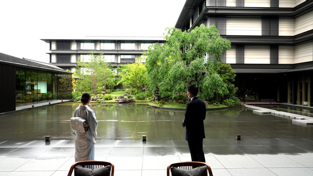 重厚な「梶井宮門」前で、常盤貴子さんを出迎えてくれたのは総支配人の楠井学さん。梶井宮門は三井総領家の邸宅・油小路邸にあった表門を一度すべて解体し、宮大工が修復、再建したホテルのシンボルです。楠井さんに招かれ、館内に足を踏み入れると、中庭を望む開放感あふれるラウンジへ。すぐそばにある「茶居」では、立札式のお茶で宿泊者をもてなします。