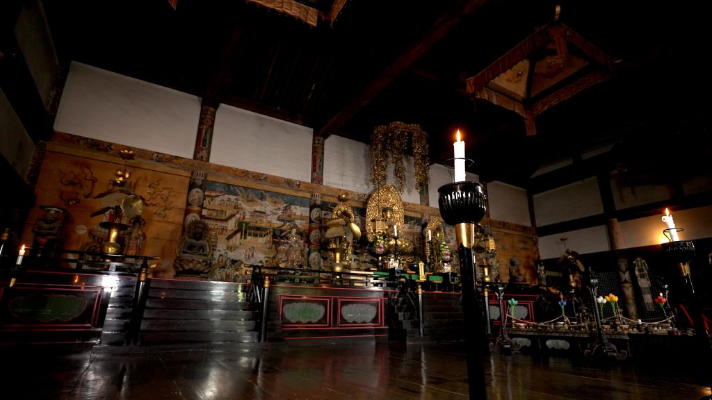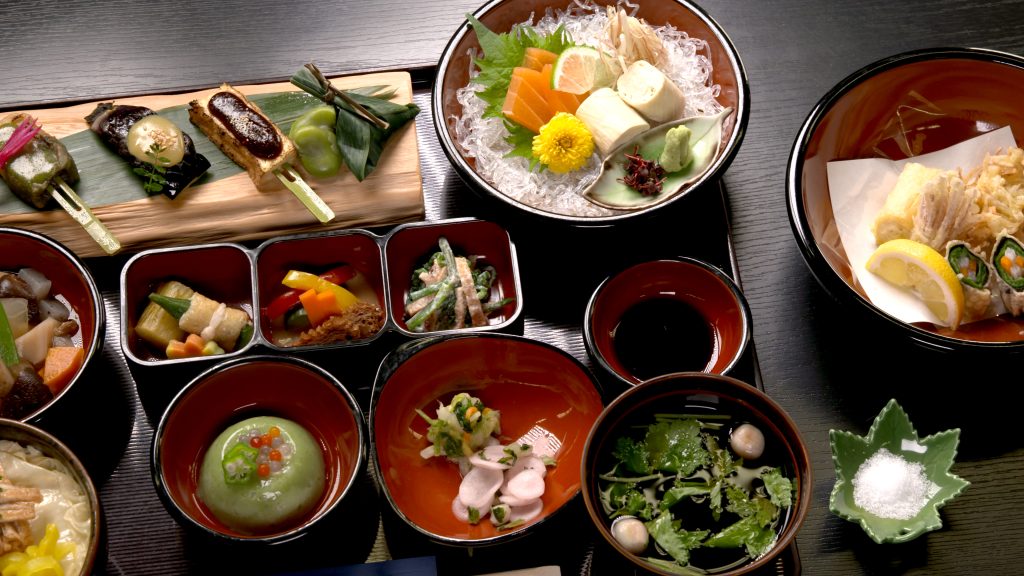 御室会館に宿泊すると、通常非公開の金堂で朝の勤行に参加することができます。金堂は、仁和寺のご本尊・阿弥陀三尊が安置される御堂。堂内には四天王像や梵天像も安置され、壁面には浄土図や観音図などが描かれています。最近ではゆっくりと自分自身と向き合いたいと願う、女性のおひとり様の滞在も多いそうです。食事は館内にある和食処「梵」で。人気メニューの「精進御前」は、昆布、シイタケ、かんぴょう、大豆などから作った精進出汁が心と身体に優しくしみていきます。