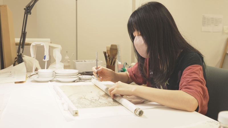 続いて訪れたのは、川嶋さんが教鞭を執り、次世代の芸術家たちに伝統と革新の技を伝える京都市立芸術大学。学校設立に携わった日本画家の幸野楳嶺(こうの ばいれい)の「模写から学ぶ」という姿勢は、今もなお引き継がれています。常盤さんが訪ねた古い日本画を模写するクラスでは、先人の残した作品から技術を読み取るため、学生たちが緻密な描画に取り掛かっています。京都府画学校の設立は、閉鎖的であった京都画壇の様々な流派の技術を統合し、新たな日本画の研究を進めることも目的の一つでした。そのため、日本画コースにはさまざまな様式を学びながら、新たな表現を模索するカリキュラムが設けられています。学生たちの一心な思いが日本画の世界をどう変えていくのか、期待に胸が膨らみます。