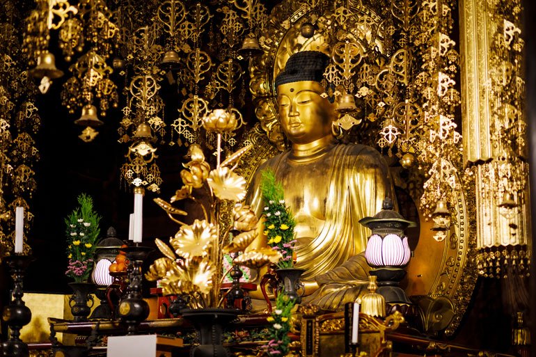御影堂では内陣を鑑賞。西側に並ぶ三つの厨子(ずし)の内部には、知恩院を整備拡張した徳川家康、家康の母である伝通院、三門と経蔵を建立した徳川秀忠の坐像が。対して、東側には法然上人の護持仏だった阿弥陀三尊立像などが安置されています。ここで少し余談ですが、御影堂は瓦や柱だけでなく、足元の畳の芯までも、全てではないものの創建当時のものがそのまま再利用されているそう。400年前、徳川家光によって建てられた御影堂の歴史を足の裏に感じながら再び阿弥陀堂に戻り、ツアーは終わりを迎えます。