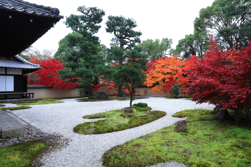 殊に書院から眺める「十牛之庭」の美しさで知られますが、訪れた際には、園路に沿って境内の高台にもぜひ足を延ばしてみましょう。お堂にすっぽりと取り囲まれたかのような庭の紅葉が見下ろせるだけでなく、京都市街地や西方の山並みなど、開放的な風景を目にすることができます。