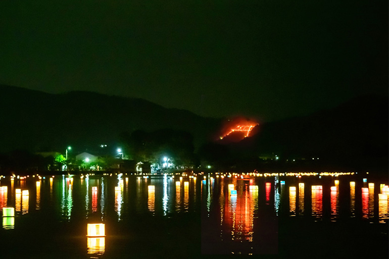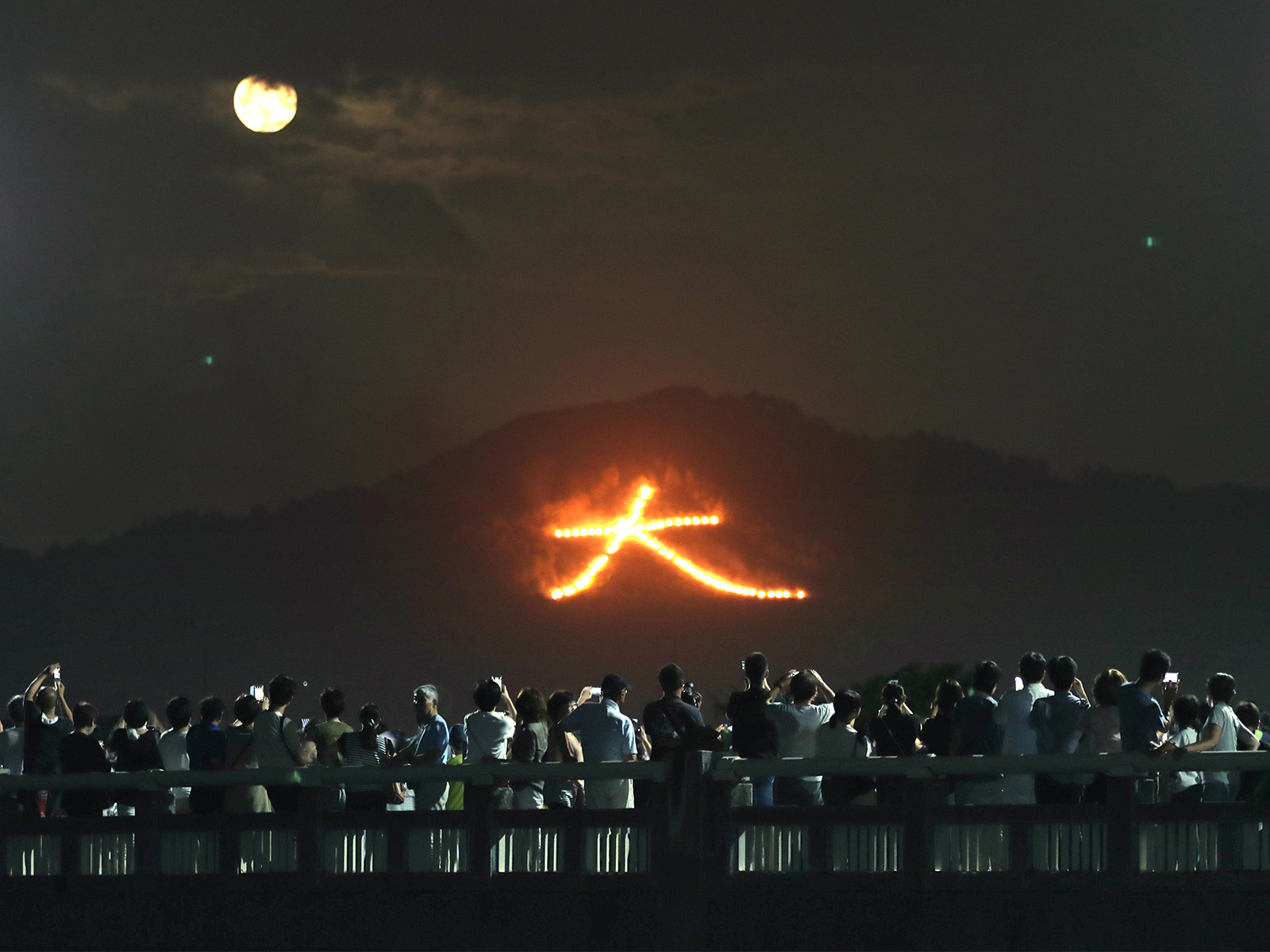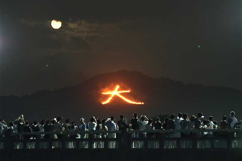 「五山送り火」は、現世に帰ってきたオショライさんを、再び冥土へと送り出す行事です。そのスケールの大きさから、すっかり京の夏の風物詩として観光名物になりましたが、本来の意味は亡くなった人や先祖の霊を供養し、お見送りすること。8月16日の夜、橋の上や交差点で送り火を眺める人々を見渡すと、静かに手を合わせる人の姿がそこかしこにあります。