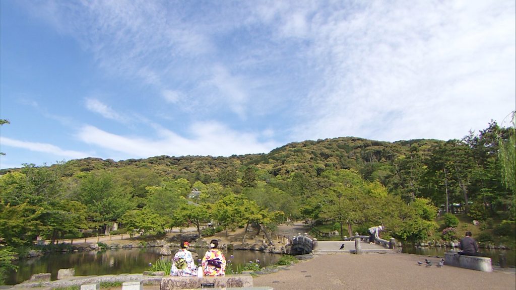 そして、東山区にある円山公園は日本画家、上村松園が絵画の勉強のために通い続けたゆかりの地。池をカエデやもみじが覆い、多彩な緑色を水面に映す。