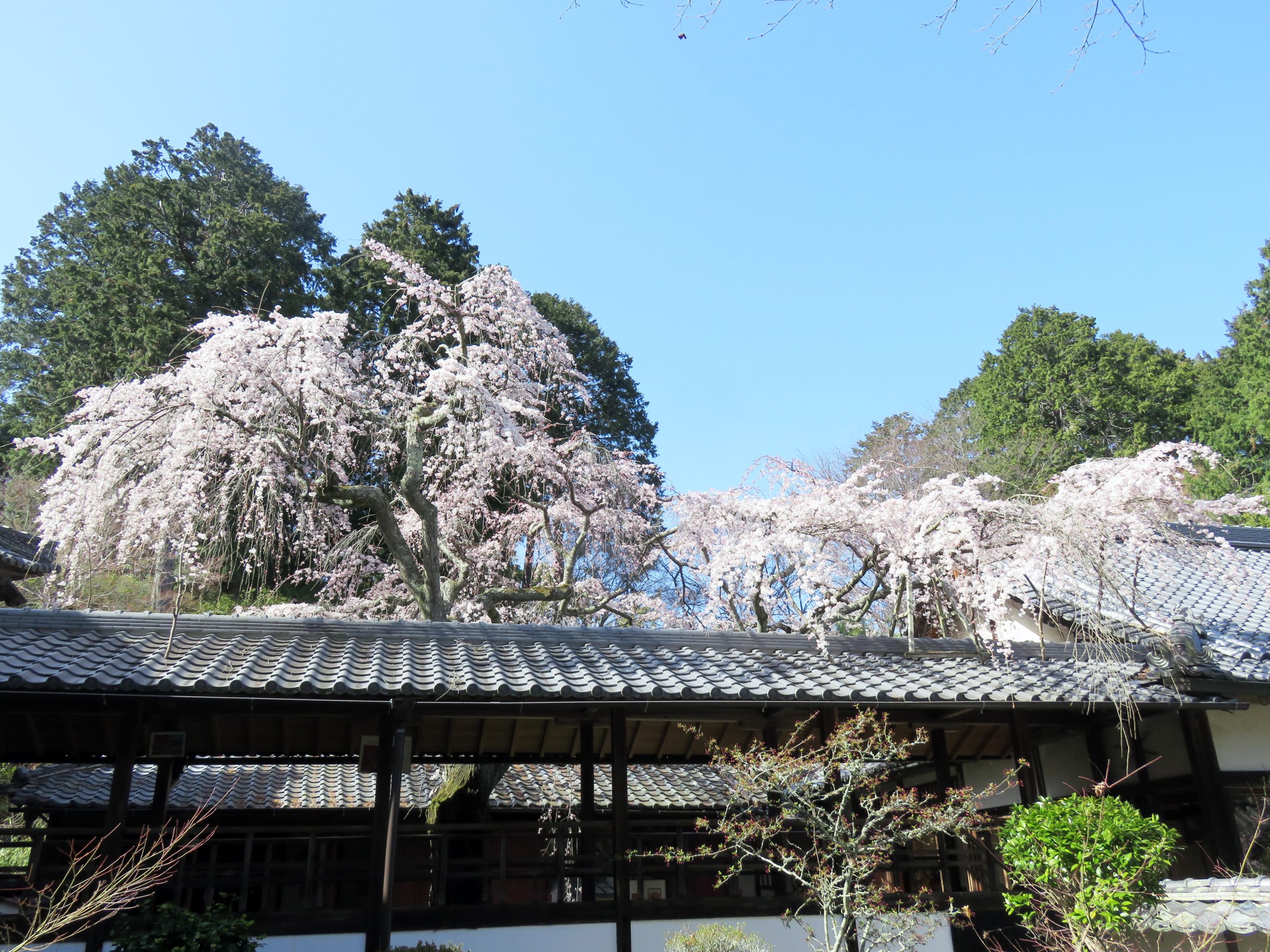 晩年、この地に隠棲(いんせい)したという在原業平(ありわらのなりひら)の名にちなんだ枝垂れ桜。業平といえば、かの古典文学「伊勢物語」に登場する「ある男」のモデルにもなった人物です。高廊下の屋根よりもはるかに高い樹高。まるで天を覆い尽くすような姿に息をのみます。